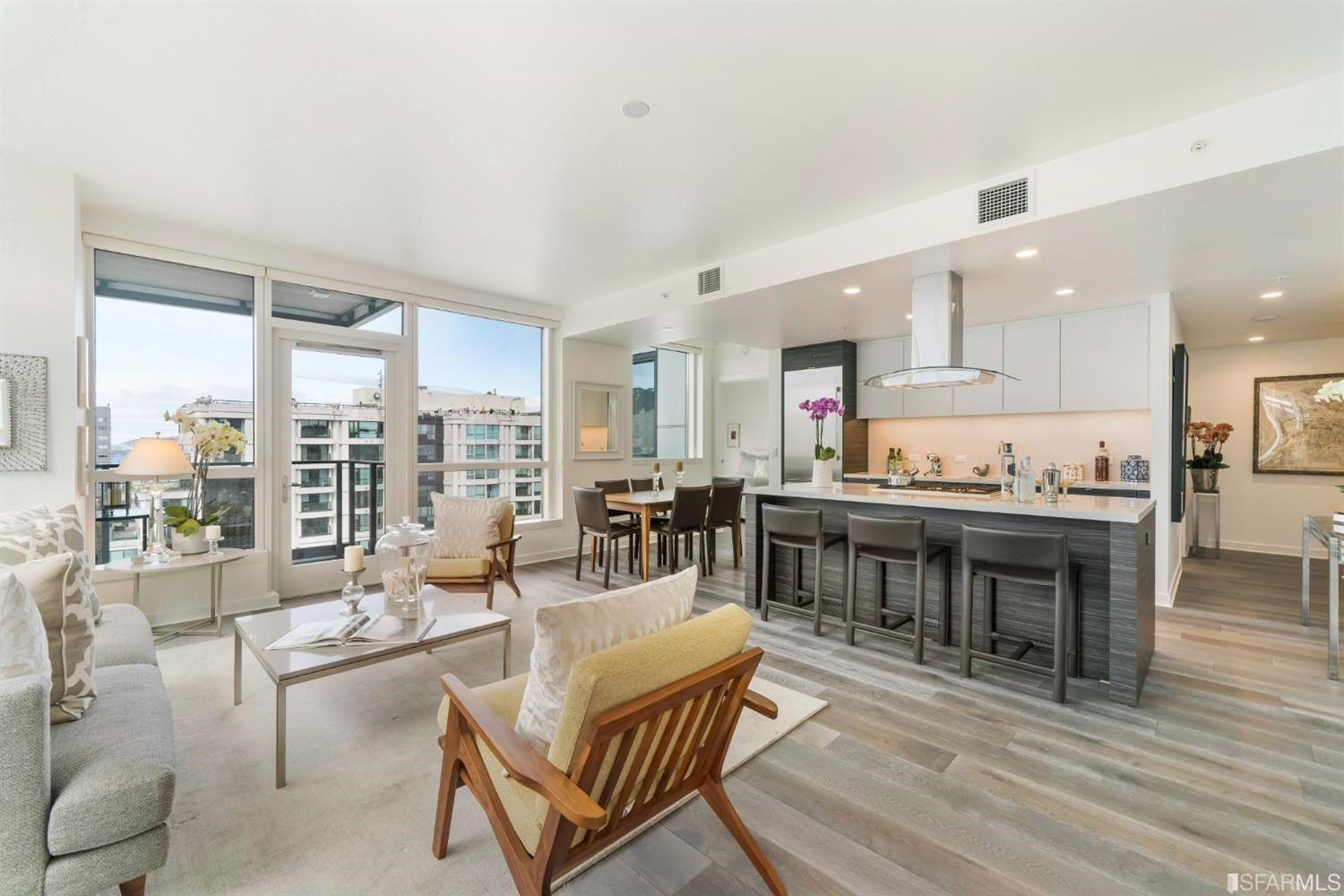 Impeccably maintained 12th-floor northwest corner residence, embraced by natural light and framed by sweeping outlooks toward Pacific Heights and Russian Hill. The welcoming entry unfolds into an open-concept living, dining, and chef’s kitchen—an elegant entertaining space anchored by a walk-out balcony perfect for morning coffee or evening sunsets. The designer kitchen features a modern waterfall island, Studio Becker cabinetry, quartz countertops, and premium Bosch appliances.